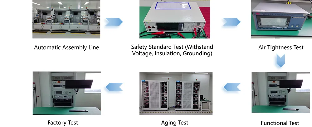 ఉత్పత్తి CCC (చైనా కంపల్సరీ సర్టిఫికేషన్), CE (యూరోపియన్ యూనియన్), UL (యునైటెడ్ స్టేట్స్) మరియు EN50498తో సహా స్వదేశంలో మరియు విదేశాలలో అధికారిక ధృవపత్రాలను పొందింది. ఇది NB/T33001-2025 మరియు GB31241-2014 ప్రమాణాలకు అనుగుణంగా ఉంటుంది, విద్యుత్ భద్రత మరియు విద్యుదయస్కాంత అనుకూలతను నిర్ధారిస్తుంది. మేము ఆధునిక ఉత్పత్తి స్థావరాన్ని కలిగి ఉన్నాము మరియు V0 రేటింగ్ మరియు FR-4 ఫైబర్గ్లాస్ PCB బోర్డ్లతో కూడిన ఫ్లేమ్-రిటార్డెంట్ ABS+PC కాంపోజిట్ మెటీరియల్ హౌసింగ్ను స్వీకరించాము. కీ సోల్డర్ జాయింట్లు వేవ్ టంకం సాంకేతికతను ఉపయోగించి ప్రాసెస్ చేయబడతాయి మరియు 5,000 ఇన్సర్షన్/ఎక్స్ట్రాక్షన్ సైకిల్స్, వైబ్రేషన్ రెసిస్టెన్స్ మరియు సాల్ట్ స్ప్రే తుప్పు నిరోధకత వంటి కఠినమైన పరీక్షలలో ఉత్తీర్ణత సాధించాయి. ప్రతి యూనిట్ ఫ్యాక్టరీ నుండి బయలుదేరే ముందు 72-గంటల పూర్తి-లోడ్ వృద్ధాప్య పరీక్షకు లోనవుతుంది, 100% అర్హత రేటును సాధిస్తుంది. మేము ఒక సమగ్ర నాణ్యత నియంత్రణ వ్యవస్థను ఏర్పాటు చేసాము, ఇది ముడి పదార్థాల సేకరణ నుండి తుది ఉత్పత్తి డెలివరీ వరకు పూర్తి ట్రేస్బిలిటీని అనుమతిస్తుంది.